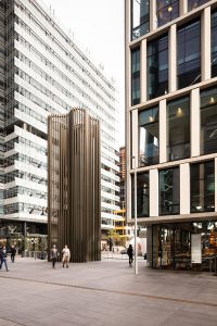 It has three storeys comprising concrete floors, with roof generated by structural steel and the striking building form is zinc clad. With surfaces built to the allowable building envelope using this tapering building form and complex structural solution, floor space was maximized to the benefit of the development and client.