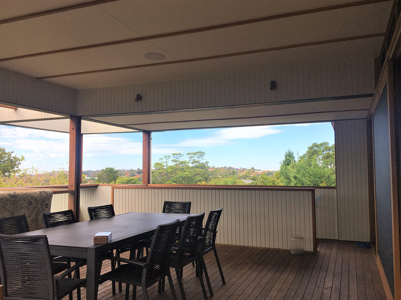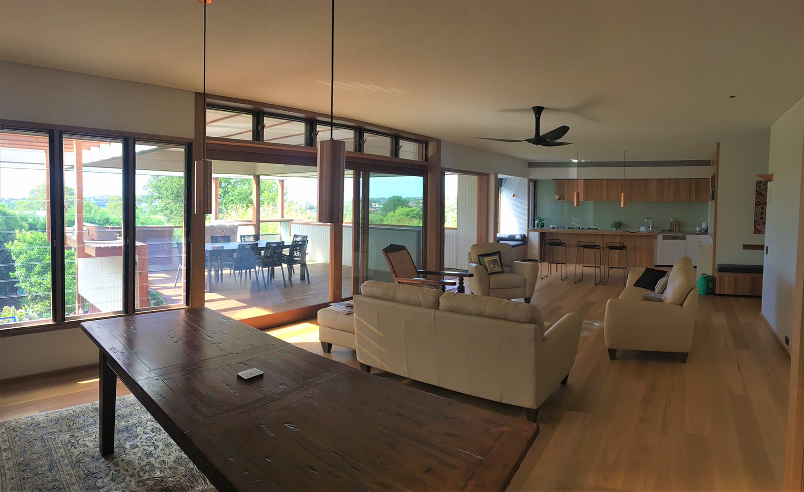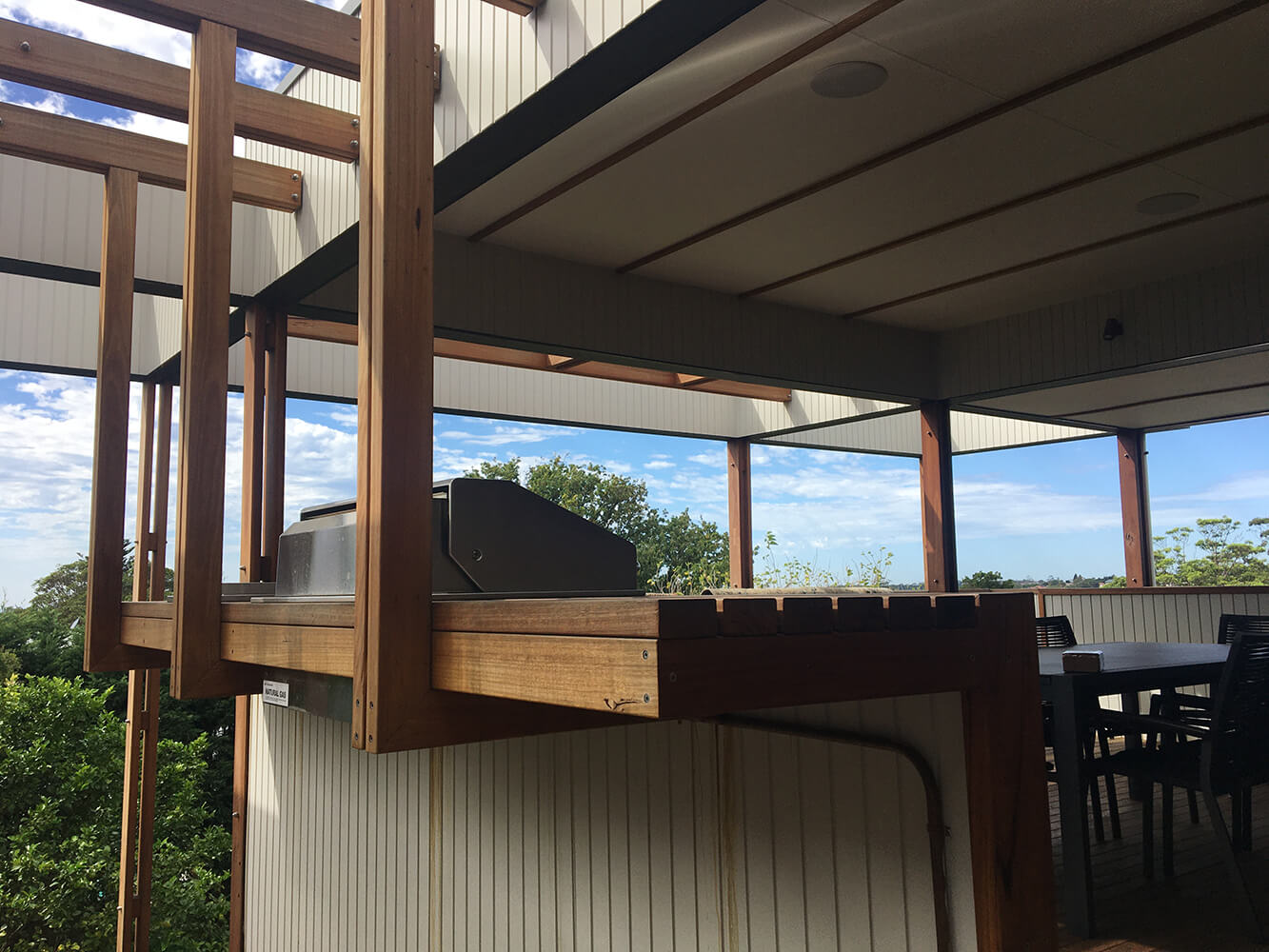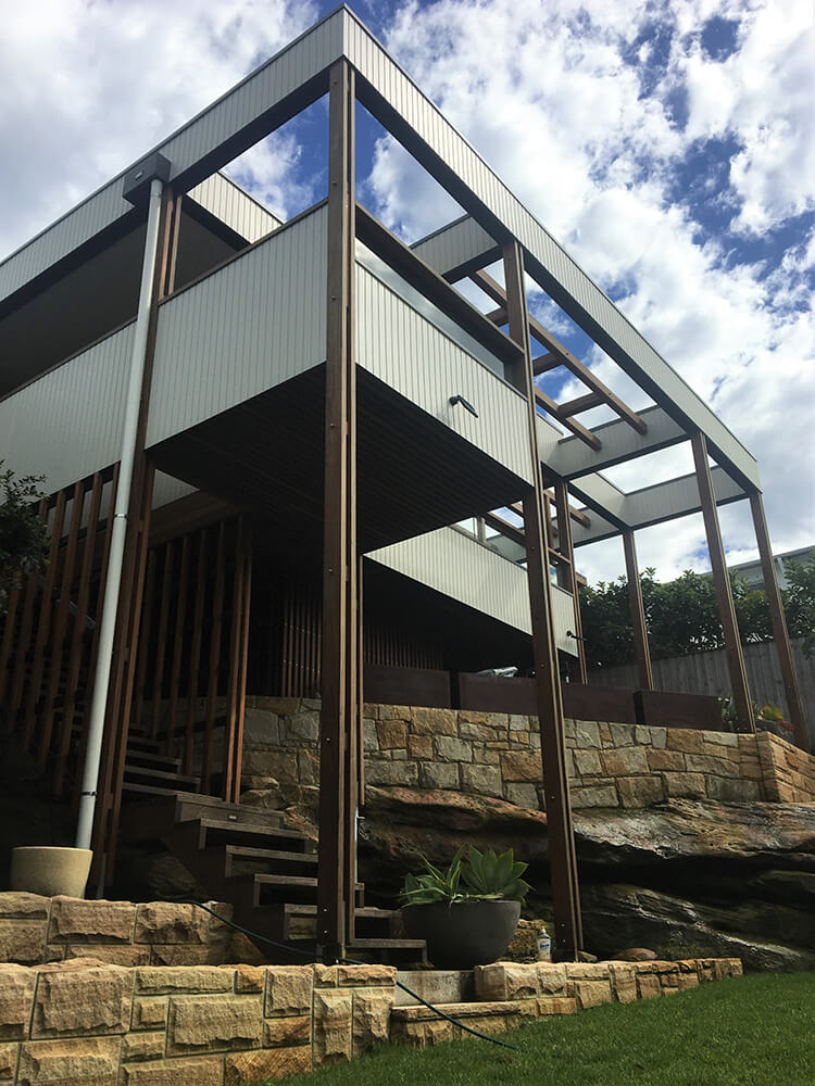 Rear extension involving significant opening up of rear room and large, elevated timber deck with tall, slender paired columns and beautifully featured USA hardwood timber throughout. All connections exposed and finely detailed in close collaboration with the architect and mutual understanding based on years of working together.