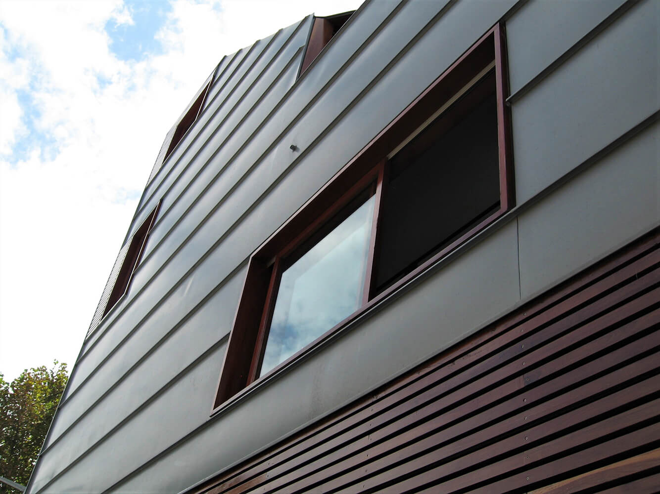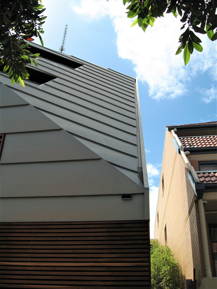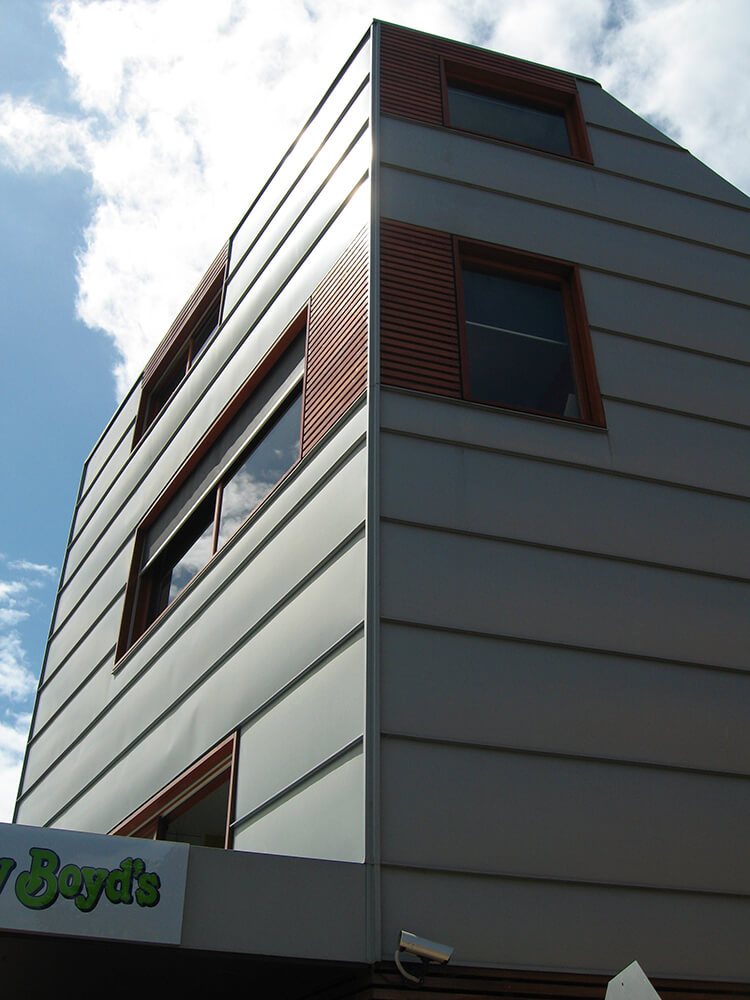 It has three storeys comprising concrete floors, with roof generated by structural steel and the striking building form is zinc clad. With surfaces built to the allowable building envelope using this tapering building form and complex structural solution, floor space was maximized to the benefit of the development and client.