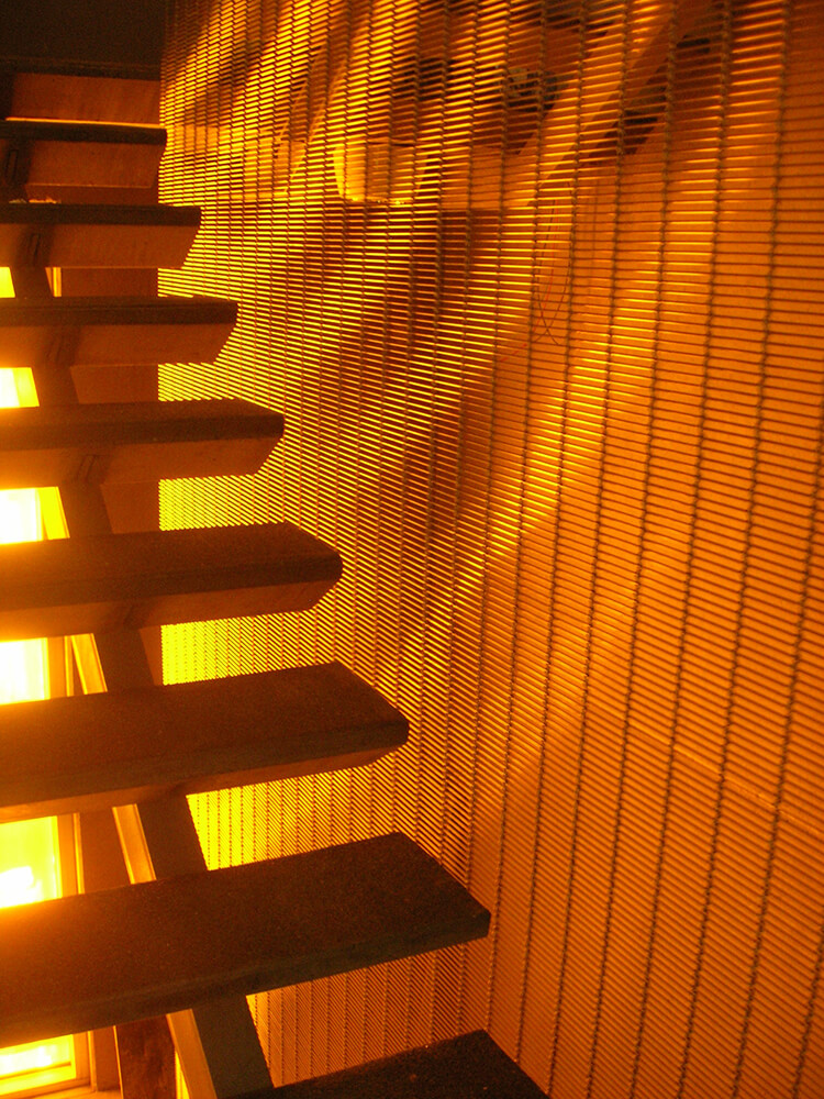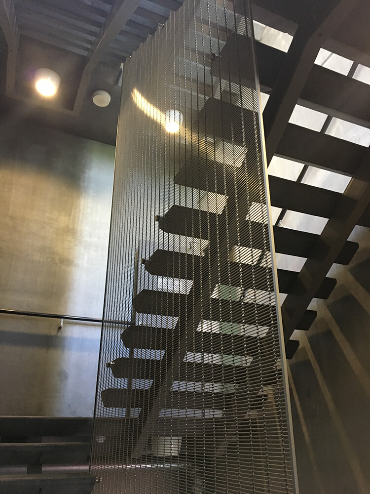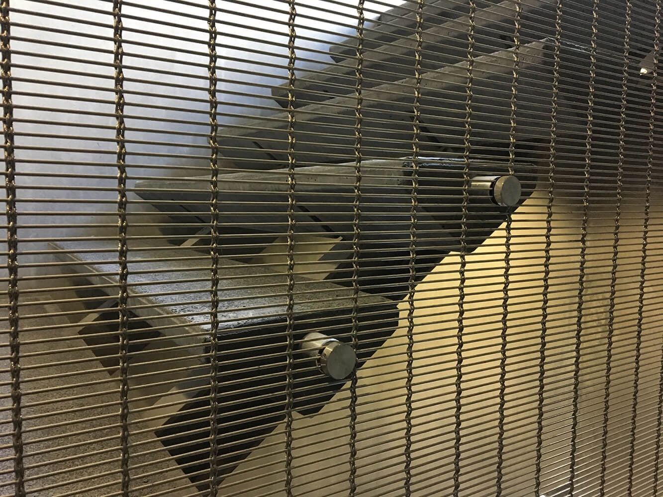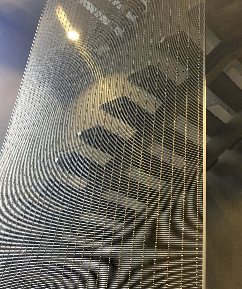 Feature façade with large scale aboriginal artwork printed onto perforated metal screen, and bespoke steel and precast concrete tread with suspended stainless steel mesh balustrade