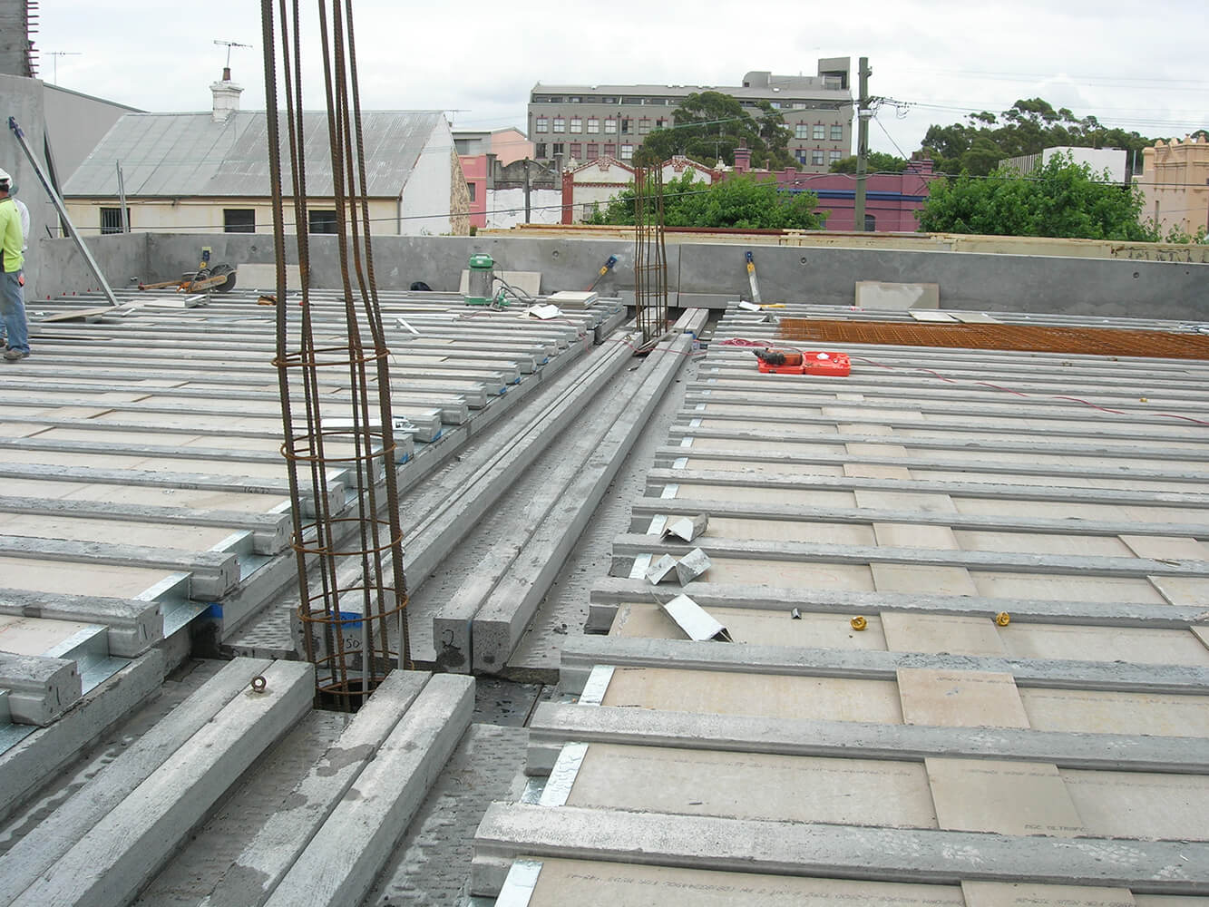 New three storey building for Koori Radio and commercial tenants, incorporating precast wall panels alongside insitu concrete cantilever elements, and with Ultrafloor precast rib and prestressed beam flooring.