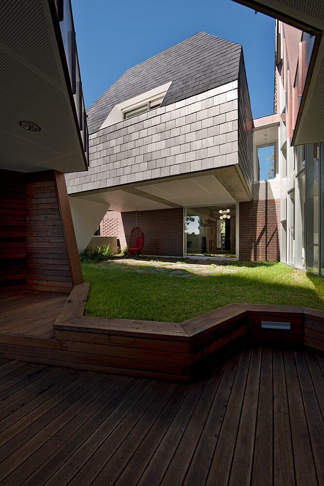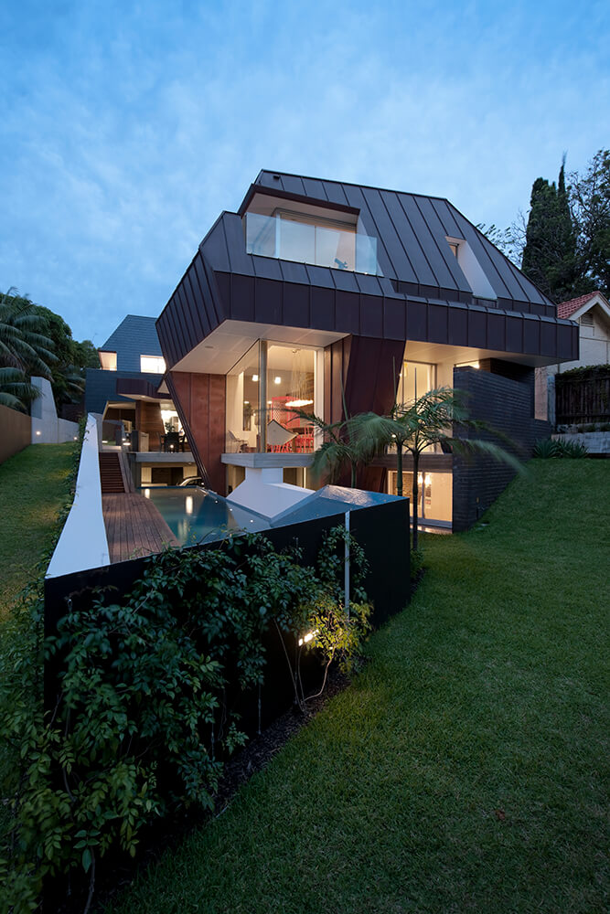 Architecturally designed by MCK Architecture and Interiors, this residence is a folded clad robust form which follows the natural steep site contours and reveals stepped discreet spaces and rooms as it progresses down slope from the street frontage. Deep cantilever shaded spaces are formed from the complex structure while external/internal adaptable spaces are created with the pool set at the low point of the residence against the spectacular views from the garden. The residence was the winner of the 2011 Wilkinson Award for residential architecture.