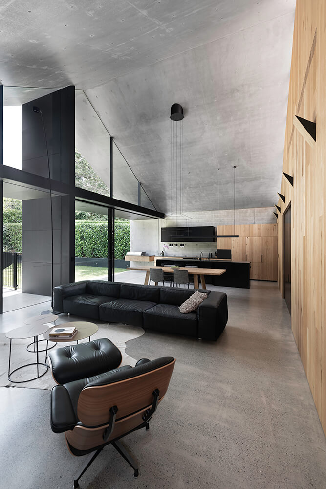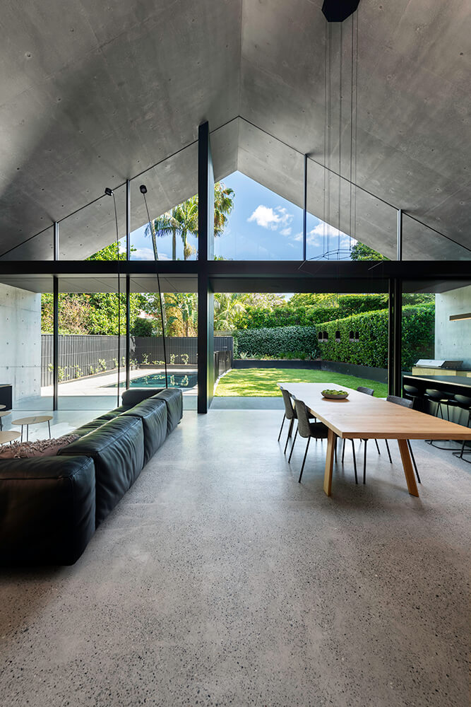 Extruded House is a showcase of off-form concrete as both a structural and finishing solution to the concept of an open plan room. The geometric form of the concrete pitched roof and walls is extruded from the original profile of the building it connects to. The structural engineering resolution of this is complex and required an unusual full arching analysis of the roof form with discreet locating of critical tie elements to control cracking and prevent spread of the roof. The sloped roof pitch was difficult to construct in off form concrete and this was recognised in the project as the winner of the Concrete Institute of USA, Excellence in Concrete Award ASCE 2019.
