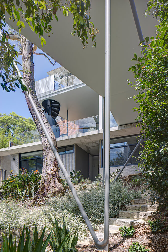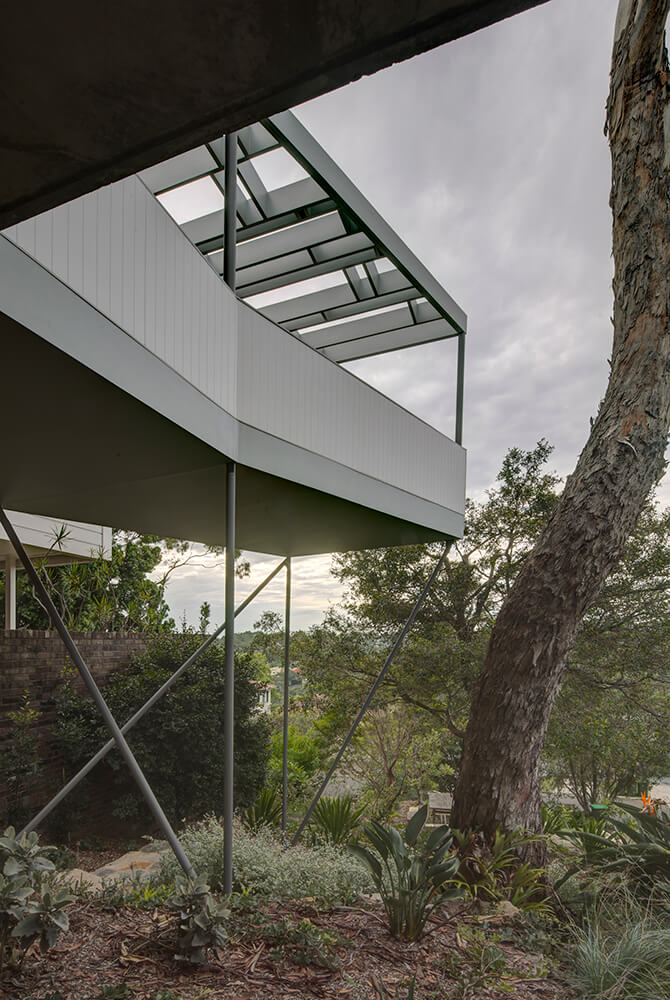 The steep headland site of this new feature residence in Middle Harbour posed many challenges and guided elevated platforms are perched behind the original building on a complex arrangement of inclined slender steel posts. Off form concrete is another special aspect of the project and the lightweight roof highlight windows scoop upwards to gather light into the spaces and offer treetop views.