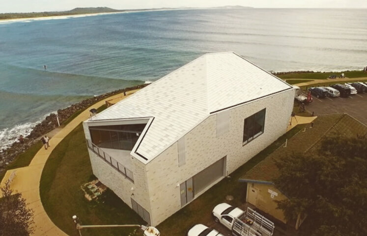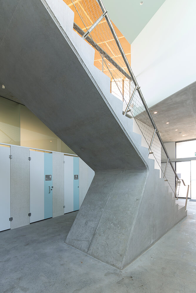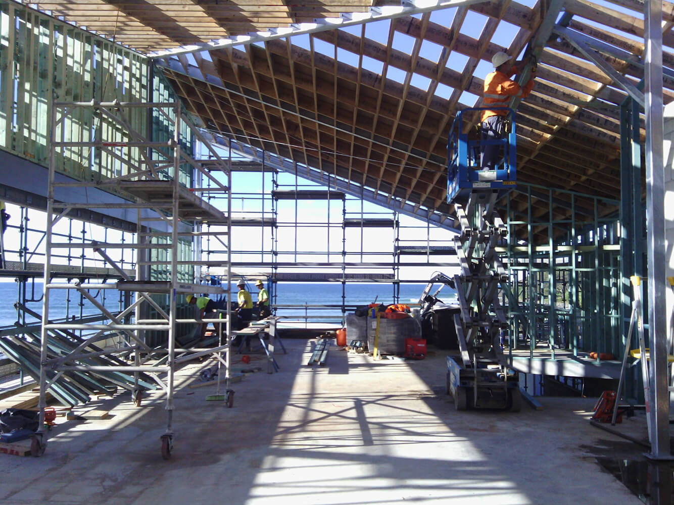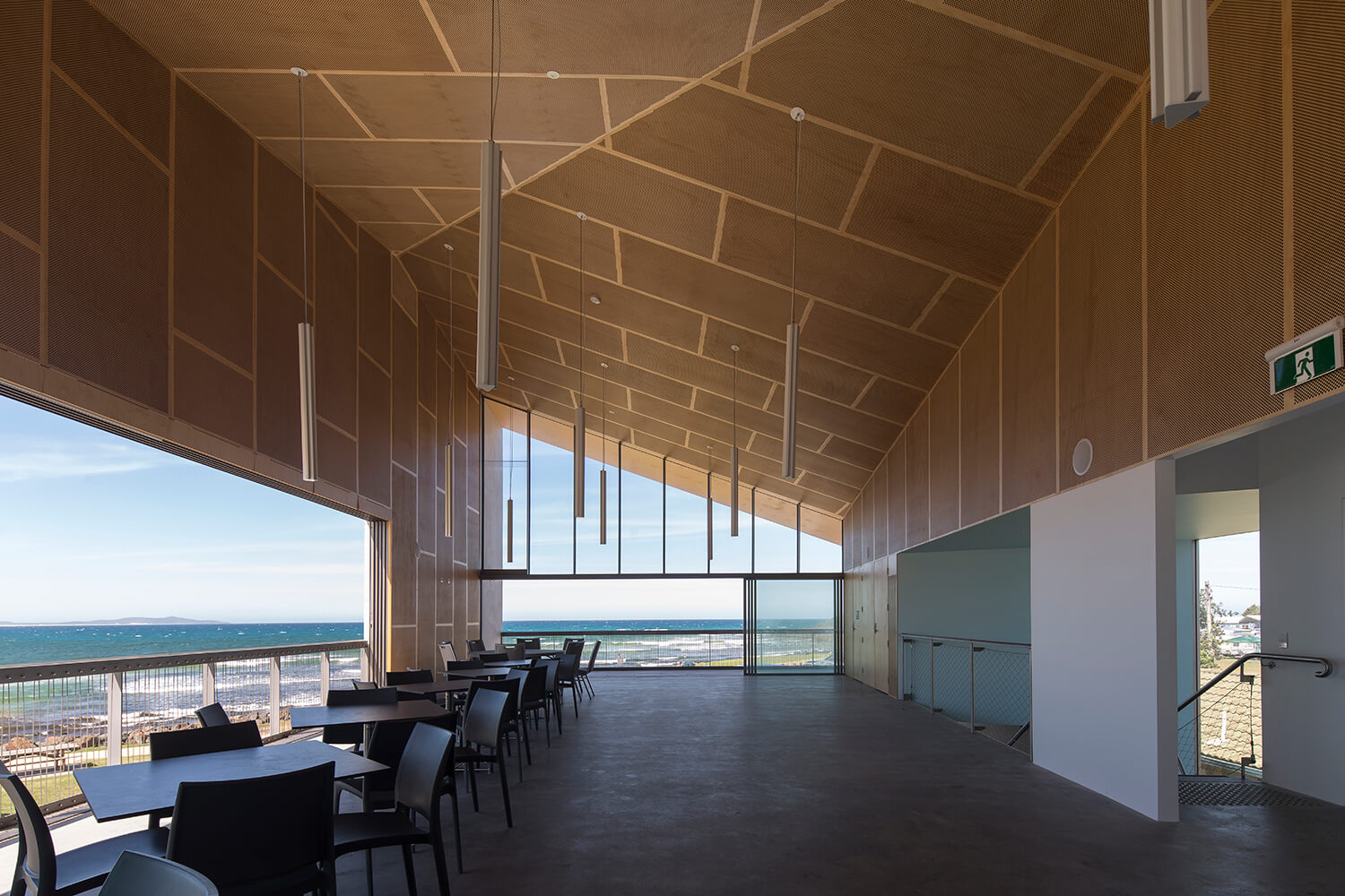 This new feature surf club building includes highly detailed cantilever terrace areas and extensive steel framed glazed façade elements at this highly corrosive, coastal exposed site. Surf club facilities are focused at ground floor including a fuel store for surf craft, community café and changerooms, while the first floor is a single open plan room with folded ceilings and large 11m clear span, openable glass door areas to capture the spectacular views.