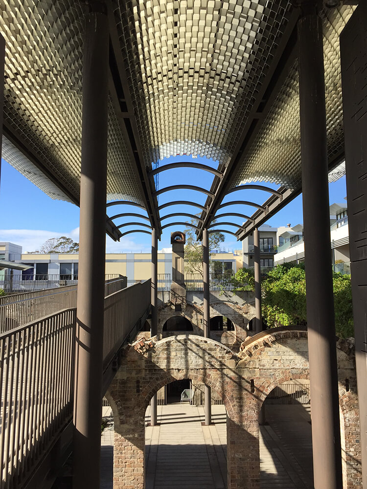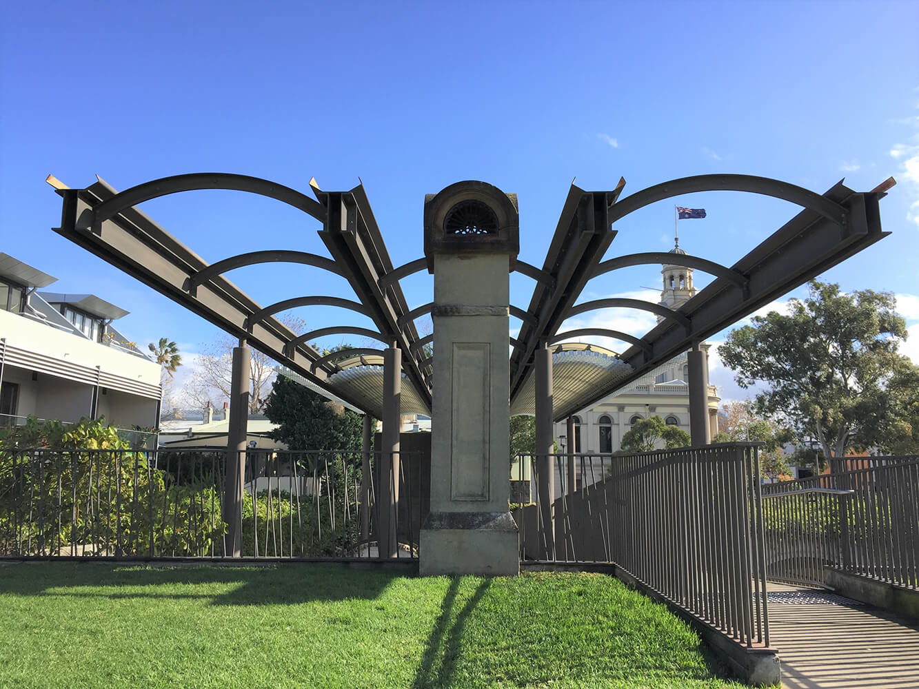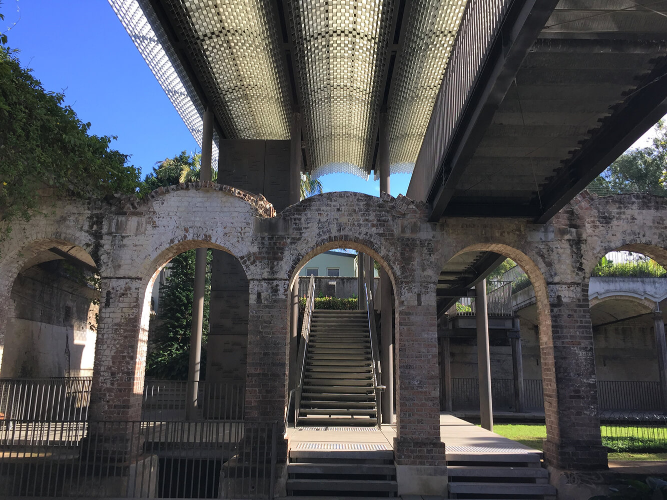 The work required structural stabilisation and repair of the existing brick vaulted roof arch structures while safely maintaining the ruined character of the space. New reinforced concrete feature works strengthen the original dilapidated structures while ensuring their integrity into the future and soaring new steel framed shade structures reflect the arch forms of the original reservoir roof with the new urban park made fully accessible via new lift access and ramps.