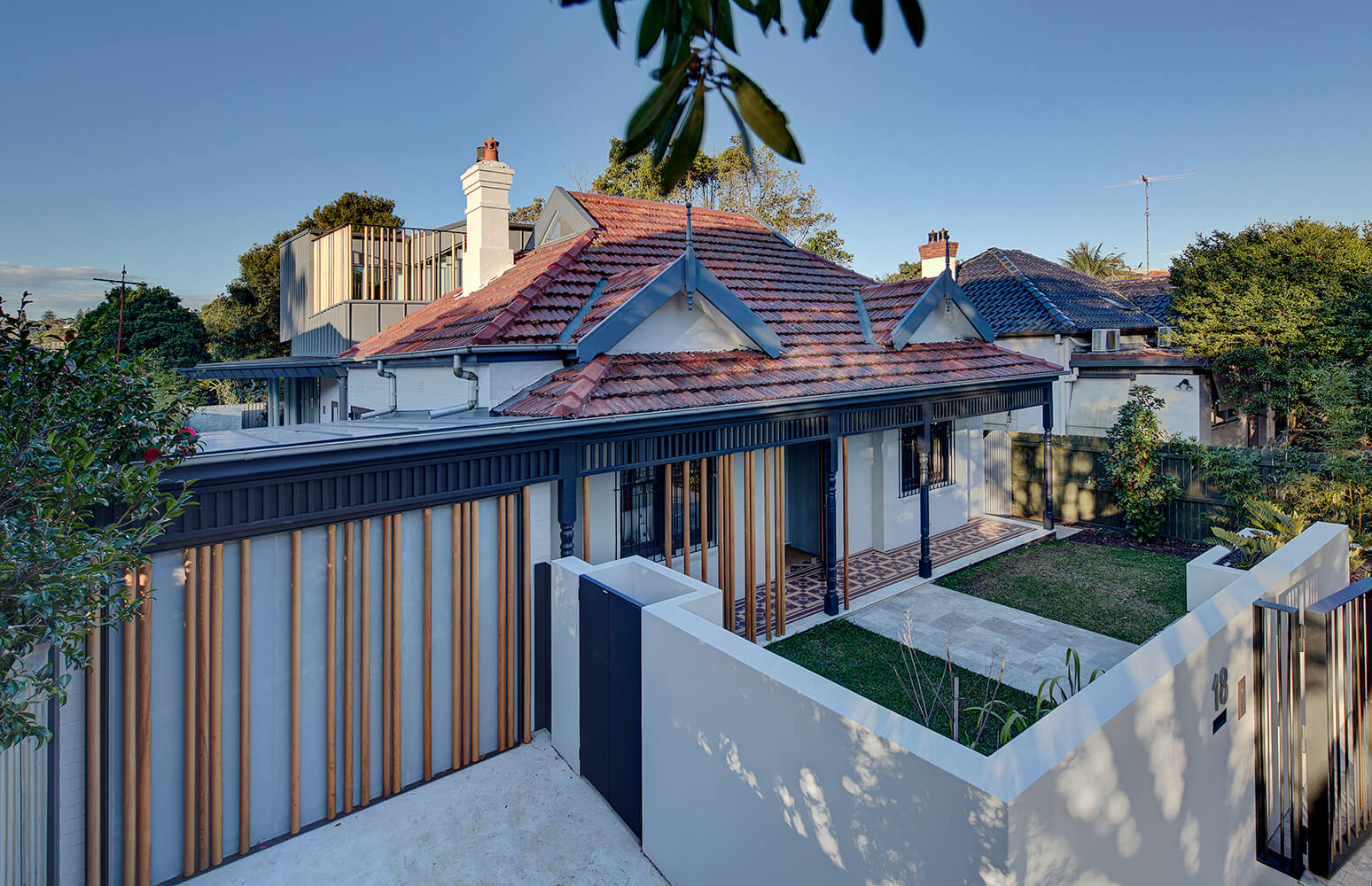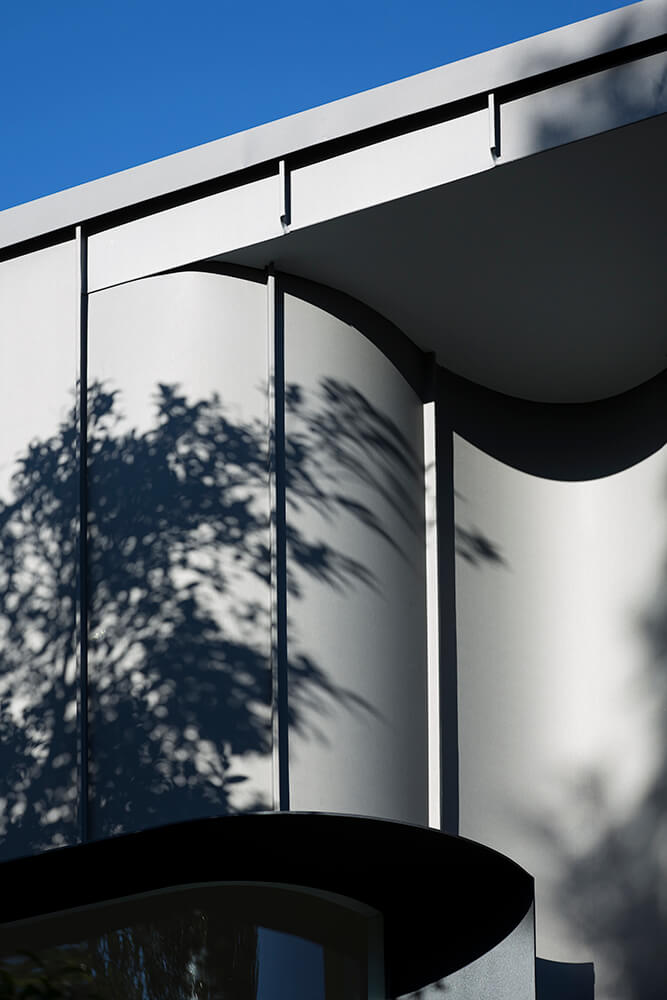 A folded and curved, zinc clad rear addition to this residence was the main focus for the project and the upper level is supported on an array of small diameter steel columns which intertwine with interior walls, screens and external glazing around two sides. A deep cantilever awning around the glazed sides provides shade and the project was published and voted one of the top houses of 2016 in ArchitectureAU.